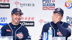 [OSEN=창원, 이대선 기자] 17일 오후 경남 창원 마산종합운동장 올림픽기념공연장에서 2015 타이어뱅크 KBO리그 포스트시즌 플레이오프 미디어데이가 열렸다. 두산 유희관과 김현수가 미소를 짓고 있다. 두산이 넥센을 준플레이오