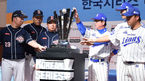 [OSEN=대구, 지형준 기자] 25일 오후 대구경북디자인센터 컨벤션홀에서 열린 한국시리즈 미디어데이에서 두산 유희관, 김현수가 챔피언 트로피를 바라보고 있다. 2년 만에 리턴매치가 벌어진다. 삼성 라이온스와 두산 베어스가 20