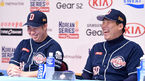 [OSEN=대구, 지형준 기자] 25일 오후 대구경북디자인센터 컨벤션홀에서 열린 한국시리즈 미디어데이에서 두산 유희관, 김현수가 김태형 감독의 답변에 즐거워하고 있다. 2년 만에 리턴매치가 벌어진다. 삼성 라이온스와 두산 베