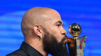 [OSEN=이대선 기자] 24일 오후 서울 서초구 The-K 호텔 컨벤션센터 그랜드볼룸에서 올 시즌 최고의 활약을 선보인 MVP와 신인상을 선정하는 2015 타이어뱅크 KBO 시상식이 열렸다. KBO MVP를 수상한 NC 테임즈가 트로피에 키스를 하고 있
