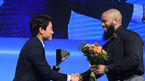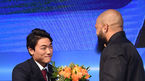 [OSEN=박준형 기자] 24일 오후 서울 서초구 The-K 호텔 컨벤션센터 그랜드볼룸에서 열린 '2015 타이어뱅크 KBO 어워즈'에서 퓨처스리그 타율상을 수상한 김태진이 테임즈의 축하를 받고 있다. 이날 시상식은 올 시즌 최고의 활약을 선