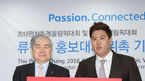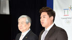 [OSEN=민경훈 기자] 26일 오후 서울 중구 프레스센터에서 열린 류현진(LA다저스)의 2018 평창 동계올림픽 홍보대사로 위촉식에서 류현진이 조양호 조직위원장에게 위촉패를 받은 후 포토타임을 갖고 있다. 홍보 대사 위촉식에서는