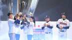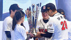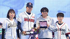 [OSEN=잠실실내체, 백승철 기자] 28일 오후 서울 잠실 실내체육관에서 열린 두산 베어스 팬페스트(Fanfest)에서 민병헌, 장원준이 팬들에게 우승 트로피를 전달하고 있다. 두산 베어스가 '2015 한국시리즈 우승 기념 팬페스트(Fanfest)'
