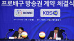 [OSEN=이대선 기자] 21일 오전 서울 마포구 스탠포드호텔 그랜드볼룸에서 '프로배구 방송권 계약 체결식'이 열렸다.구자준 프로배구 총재와 최철호 KBS N 대표이사가 계약서에 사인을 하고 있다.KOVO와 KBS N은 2016-2017시즌부터 2020-202