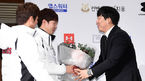 [OSEN=백승철 기자] 김현수가 29일 오후 서울 강남구 컨벤션 벨라지움에서 열린 볼티모어 오리올스 입단 기자회견에서 두산 허경민과 박건우의 축하를 받고 있다.볼티모어 오리올스는 지난 24일 김현수와의 2년 계약을 공식 발표
