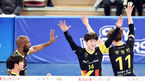 [OSEN=천안, 이동해 기자] 13일 오후 충남 천안시 유관순체육관에서 열린 '2015-2016 NH농협 V-리그' 남자부 현대캐피탈과 OK저축은행의 경기 현대캐피탈 선수들이 1세트를 잡고 환호하고 있다.최태웅 감독이 지휘하는 현대캐피탈은 지
