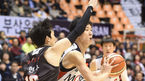 [OSEN=부산, 정송이 기자] 9일 오후 부산 사직실내체육관에서 '2015-2016 KCC 프로농구' 부산 KT와 울산 모비스의 경기가 열렸다.2쿼터, 모비스 전준범이 KT 김현수 수비를 뚫고 돌파하고 있다.부산으로 원정을 나선 모비스는 31승 17패