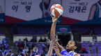 [OSEN=부천, 백승철 기자] 13일 오후 경기도 부천시 부천실내체육관에서 열린 '2015-2016 KDB생명 여자프로농구' KEB하나은행과 우리은행의 경기 4쿼터 굿렛이 첼시 리를 앞에두고 슛을 시도하고 있다.우리은행은 이미 정규리그 우승을