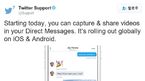 [OSEN=신연재 기자] 트위터가 위기 극복을 위한 새로운 기능을 하나 더 선보였다. 이제 트위터 다이렉트메시지(일명 쪽지)에서 동영상을 녹화하고 다른 유저들과 찍은 동영상을 나눌 수 있게 됐다.미국 IT전문 매체 ‘더버지&rs