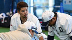 [OSEN=미야자키(일본), 백승철 기자] 두산 베어스 보우덴이 20일 오후 일본 미야자키 소켄구장 실내연습장에서 훈련 중 자신의 훈련 도구를 한용덕 코치에게 설명하고 있다.호주 시드니에서 1차 전지훈련을 소화한 두산 베어스가 2