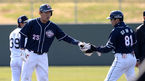 [OSEN=미야자키(일본), 백승철 기자] 21일 오후 일본 미야자키 소켄구장에서 열린 두산 베어스와 오릭스 버팔로스의 연습경기 4회초 2사 양의지가 2루타를 치고 강동우 코치에게 보호대를 건내고 있다.스프링캠프 첫 연습경기에 나