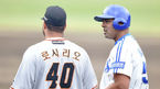 [OSEN=오키나와, 이대선 기자] 25일 오후 일본 오키나와 온나손에 있는 아카마구장에서 삼성 라이온즈와 한화 이글스의 경기가 열렸다.1회말 삼성 발디리스가 안타를 치고 한화 로사리오와 이야기를 나누고 있다. /sunday@osen.co.kr