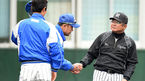 [OSEN=오키나와, 이대선 기자] 27일 일본 오키나와 기노자구장에서 한신 타이거즈와 삼성 라이온즈의 연습경기가 열렸다.경기에 앞서 한신 다카시로 코치가 삼성 코치진과 인사를 나누고 있다.양 팀은 나란히 핵심 투수를 선발로