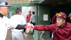[OSEN=오키나와, 이대선 기자] 29일 일본 오키나와 고친다구장에서 한화 이글스와 넥센 히어로즈의 연습경기가 열렸다.경기에 앞서 한화 송신영이 넥센 코치진과 인사를 하고 있다.한화는 지난 27일 킨구장에서 열린 KIA와의 연습