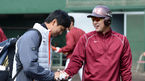 [OSEN=오키나와, 이대선 기자] 29일 일본 오키나와 고친다구장에서 한화 이글스와 넥센 히어로즈의 연습경기가 열렸다.경기에 앞서 한화 심수창이 넥센 이택근과 인사를 나누고 있다.한화는 지난 27일 킨구장에서 열린 KIA와의 연
