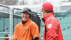 [OSEN=울산, 민경훈 기자] 8일 오후 울산 문수야구장에서 롯데 자이언츠와 SK 와이번스의 '2016 타이어뱅크 KBO리그' 첫 시범경기를 앞두고 양 팀이 훈련 시간을 가졌다.SK 박경완 배터리 코치가 롯데 강민호와 즐겁게 얘기를 나누고