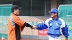 [OSEN=울산, 민경훈 기자] 10일 오후 울산 문수야구장에서 롯데 자이언츠와 삼성 라이온즈의 '2016 타이어뱅크 KBO리그' 시범경기, 경기 전 양팀 훈련 시간에 롯데 강민호가 삼성 류중일 감독과 하이파이브를 하고 있다.시범경기는 8