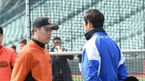 [OSEN=울산, 민경훈 기자] 10일 오후 울산 문수야구장에서 롯데 자이언츠와 삼성 라이온즈의 '2016 타이어뱅크 KBO리그' 시범경기, 경기 전 양팀 훈련 시간에 롯데 강민호가 삼성 류중일 감독에게 말을 하고 있다.시범경기는 8일에
