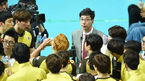[OSEN=안산, 이대선 기자] 12일 오후 경기 안산 상록수체육관에서 ‘NH농협 2015-2016 V-리그 플레이오프 1차전’ OK저축은행과 삼성의 경기가 열렸다.1세트 작전타임 때 OK저축은행 김세진 감독이 선수들에게 작전을 지시하고