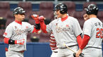 [OSEN=고척, 곽영래 기자] 15일 오후 서울시 고척스카이돔에서 '2016 타이어뱅크 KBO 리그' 넥센 히어로즈와 SK 와이번스의 시범경기가 열렸다.4회초 2사 만루 SK 김강민이 홈런을 때린 뒤 동료들과 하이파이브를 하고 있다./ youngrae@ose
