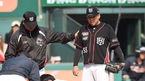 [OSEN=인천, 지형준 기자] 25일 오후 인천 SK행복드림구장에서 열린 '2016 타이어뱅크 KBO리그' 시범경기 SK 와이번스와 NC다이노스의 경기, 7회말 1사 3루에서 SK 이대수가 1타점 우전 적시타를 날리고 박진만 코치와 주먹을 맞대고 있