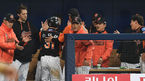 [OSEN=고척, 최규한 기자] 1일 오후 서울 고척스카이돔에서 '2016 타이어뱅크 KBO 리그' 넥센 히어로즈와 롯데 자이언츠의 개막전이 열렸다.5회초 1사 2루 상황 아두치의 달아나는 1타점 적시타 때 홈을 밟은 손아섭이 더그아웃 동료