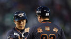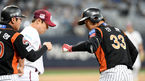 [OSEN=고척, 최규한 기자] 1일 오후 서울 고척스카이돔에서 '2016 타이어뱅크 KBO 리그' 넥센 히어로즈와 롯데 자이언츠의 개막전이 열렸다.1회초 롯데 공격 정훈이 안타를 날리고 1루에 안착해 정보명 코치와 인사를 나누고 있다.