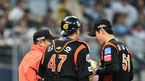 [OSEN=고척, 민경훈 기자] 3일 오후 서울 고척스카이돔에서 '2016 타이어뱅크 KBO 리그' 넥센 히어로즈와 롯데 자이언츠의 경기가 열렸다.9회말 1사 주자 1,2루 넥센 윤석민 타석에서 마운드에 오른 롯데 조원우 감독이 윤길현과 강민