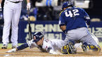 [OSEN=잠실, 백승철 기자] 5일 오후 서울 잠실구장에서 열린 '2016 타이어뱅크 KBO 리그' 두산 베어스와 NC 다이노스의 경기 2회말 2사 1,3루 3루주자 정수빈이 더블스틸에 성공하고 있다. / baik@osen.co.kr