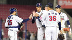 [OSEN=잠실, 백승철 기자] 5일 오후 서울 잠실구장에서 열린 '2016 타이어뱅크 KBO 리그' 두산 베어스와 NC 다이노스의 경기 종료 후 장원준이 동료들과 하이파이브를 하고 있다.두산은 이날 홈개막전에서 NC를 6-2로 꺾었다. / baik@osen.