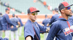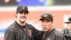 [OSEN=볼티모어(미국),박준형 기자] 5일(한국시간) 미국 메릴랜드주 볼티모어 오리올 파크에서 열린 2016 메이저리그(MLB) 볼티모어 오리올스와미네소타 트윈스의 개막전 경기에 앞서 박병호가 김현수를 바라보며 미소 짓고 있다.