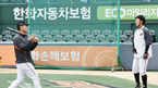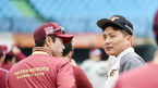 [OSEN=대전, 민경훈 기자] 6일 오후 대전 한화생명 이글스 파크에서 '2016 타이어뱅크 KBO 리그' 한화 이글스와 넥센 히어로즈의 경기가 열릴 예정인 가운데 양팀 훈련이 진행됐다.경기 전 한화 김태균이 넥센 손혁 투수 코치와 얘기