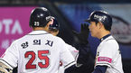 [OSEN=잠실, 백승철 기자] 8일 오후 서울 잠실구장에서 열린 '2016 타이어뱅크 KBO 리그' 두산 베어스와 넥센 히어로즈의 경기 3회말 2사 2,3루 양의지가 스리런 홈런을 치고 홈에서 정수빈의 격려를 받고 있다. / baik@osen.co.k