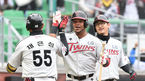 [OSEN=인천, 최규한 기자] 10일 오후 인천 SK행복드림구장에서 '2016 타이어뱅크 KBO 리그' SK 와이번스와 LG 트윈스의 경기가 열렸다.1회초 2사 1, 3루 상황 채은성이 선제 스리런포를 날리고 홈을 밟은 뒤 히메네스-박용택과 인사를 나