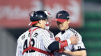 [OSEN=잠실, 이동해 기자] 12일 오후 서울 잠실야구장에서 열린 ‘2016 타이어뱅크 KBO 리그’ LG 트윈스와 롯데 자이언츠의 경기, 9회초 1사 LG 포수 정상호와 마무리 투수 임정우가 마운드에서 이야기 하고 있다. /eastsea@osen.co.kr