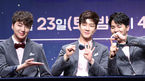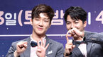 [OSEN=이대선 기자] 21일 오후 서울 상암동 JTBC 빌딩에서 JTBC 신규 프로그램 ‘반달친구’의 제작발표회가 열렸다.그룹 위너 이승훈과 송민호가 방송 시간을 손으로 표현하고 있다. /sunday@osen.co.kr