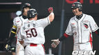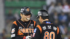 [OSEN=잠실, 민경훈 기자] 6일 오후 서울 잠실구장에서 '2016 타이어뱅크 KBO 리그' 두산 베어스와 롯데 자이언츠의 경기가 열렸다.9회초 2사 주자 1루 롯데 문규현의 1타점 2루타때 홈을 밟은 김상호가 덕아웃에서 동료들과 하이파이