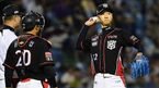 [OSEN=대전, 백승철 기자] 20일 오후 대전 한화생명 이글스 파크에서 열린 '2016 타이어뱅크 KBO 리그' 한화 이글스와 kt 위즈의 경기 4회말 2사 1,3루 정근우가 1타점 적시타를 치고 윤재국 코치와 하이파이브를 하고 있다. / baik@osen.co.