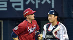 [OSEN=고척, 최규한 기자] 31일 오후 서울 고척스카이돔에서 '2016 타이어뱅크 KBO 리그' 넥센 히어로즈와 삼성 라이온즈의 경기가 열렸다.4회말 1사 3루 상황 김하성이 추격의 1타점 적시타를 날리고 1루에 안착해 강병식 코치와 인사