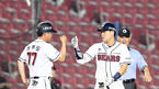 [OSEN=잠실, 최규한 기자] 7일 오후 서울 잠실야구장에서 '2016 타이어뱅크 KBO 리그' 두산 베어스와 넥센 히어로즈의 경기가 열렸다.7회말 무사 3루 상황 김재호의 1타점 희생플라이 때 홈을 밟은 박세혁이 박건우와 인사를 나누고