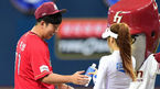 [OSEN=고척, 백승철 기자] 15일 오후 서울 구로구 고척스카이돔에서 열린 '2016 타이어뱅크 KBO 리그 올스타전' 퍼펙트피처 행사에서 나눔팀 신재영이 피칭 후 도우미로부터 음료수를 받고 있다. / baik@osen.co.kr