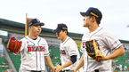 [OSEN=잠실, 지형준 기자] 2일 오후 서울 잠실야구장에서 열린 '2016 타이어뱅크 KBO 리그' 두산 베어스와 LG 트윈스의 경기, 3회초 수비를 마친 두산 유희관이 류지혁 민병헌과 하이파이브를 하고 있다. /jpnews@osen.co.kr