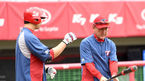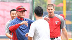 [OSEN=광주, 최규한 기자] 2일 오후 광주-KIA 챔피언스필드에서 열리는 '2016 타이어뱅크 KBO 리그' KIA 타이거즈와 한화 이글스의 경기를 앞두고, 한화 송광민과 김태완이 중계 카메라를 살피고 있다. /dreamer@osen.co.kr