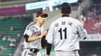 [OSEN=잠실, 곽영래 기자] 3일 오후 서울시 잠실야구장에서 '2016 타이어뱅크 KBO 리그' 두산 베어스와 LG 트윈스의 경기가 열렸다.4회말 2사 2,3루 LG 류제국이 두산 민병헌의 타구를 잡아낸 김용의와 기뻐하고 있다./ youngrae@osen.co.kr