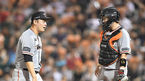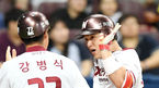 [OSEN=울산, 곽영래 기자] 11일 오후 울산 문수야구장에서 열린 '2016 타이어뱅크 KBO 리그' 롯데 자이언츠와 한화 이글스의 경기, 8회말 1사 1루 한화 송창식이 롯데 강민호를 중견수 뜬공으로 처리한 뒤 차일목이 이야기를 나누고 있