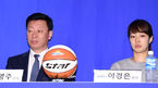[OSEN=양재,이대선 기자] 25일 오전 서울 양재동 더케이호텔 크리스탈볼륨에서 '삼성생명 2016~2017 여자프로농구 타이틀스폰서 조인식 및 미디어데이'가 열렸다.구리 KDB생명 김영주 감독과 이경은이 취재진의 질문을 듣고 있다. /sun