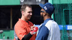 [OSEN=부산, 이동해 기자] 9일 오후 부산 사직야구장에서 열리는 '2017 타이어뱅크 KBO리그' 포스트시즌 준플레이오프 2차전 롯데 자이언츠와 NC 다이노스의 경기를 앞두고, NC 스크럭스-롯데 번즈가 이야기 나누고 있다. / eastsea@osen.c