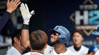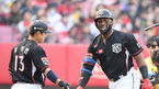 [OSEN=창원, 이동해 기자] 24일 오후 경남 창원 마산야구장에서 열린 '신한은행 MYCAR KBO리그' 개막전 NC 다이노스와 LG 트윈스의 경기, 8회말 NC 선두타자 스크럭스가 솔로홈런을 때린 후 더그아웃에서 팀원들의 축하를 받고 있다./ ea