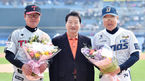 [OSEN=창원, 이동해 기자] 24일 오후 경남 창원 마산야구장에서 열린 '신한은행 MYCAR KBO리그' 개막전 NC 다이노스와 LG 트윈스의 경기 시작 전 LG 류중일ㄱ감독-NC 김경문 감독이 안상수 창원시장과 함께 포토타임을 갖고 있다. / eastse