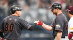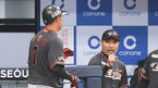 [OSEN=고척,박준형 기자]24일 서울 고척스카이돔에서 진행된 '2018 신한은행 MYCAR KBO리그' 넥센 히어로즈와 한화 이글스의 개막전 경기,2회초 한화 선두타자 호잉이 기습번트 성공한뒤 고동진 코치와 하이파이브를 하고 있다. / soul10